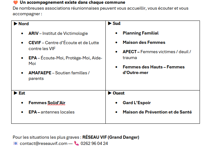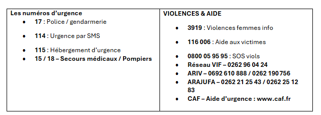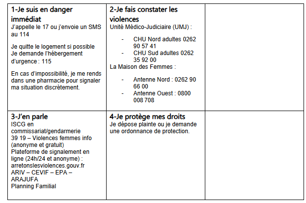 - Aide aux victimes : 0262 25 12 83